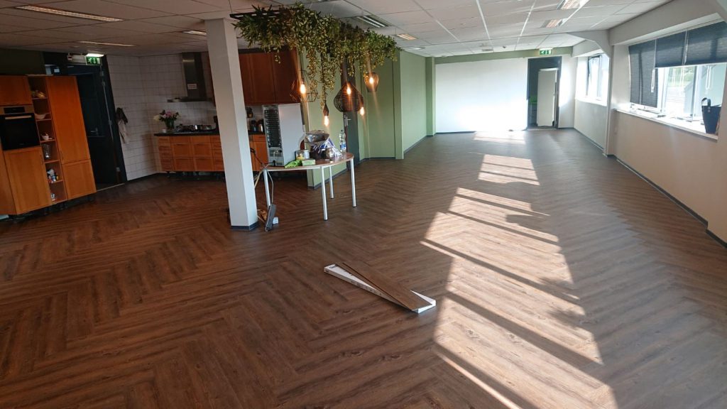 Voor Alliance Bloembollen in T Zand hebben wij 140 m2 grote visgraat pvc plakvloer in hun kantine gestoffeerd.