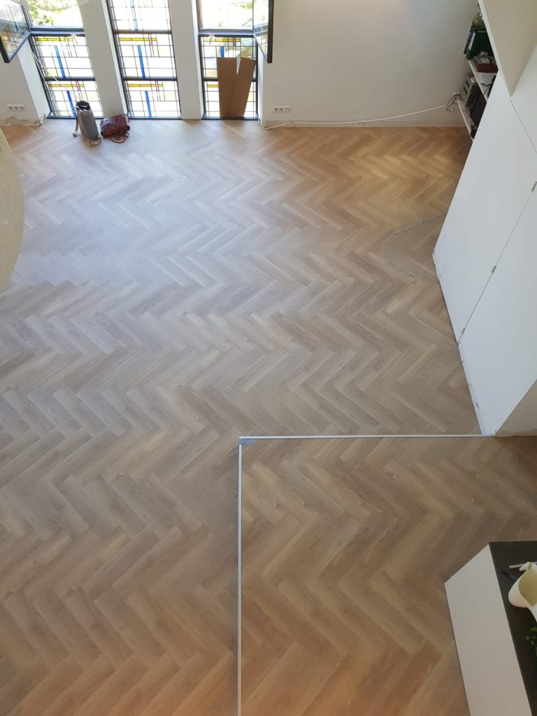 Bij een particulier in Amsterdam hebben wij deze mooie visgraat PVC plakvloer gelegd. Let op de overgang van het decor naar het verhoogde gedeelte. Daar worden we blij van.