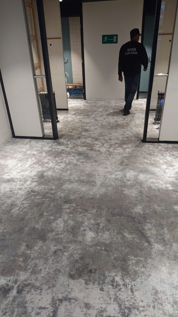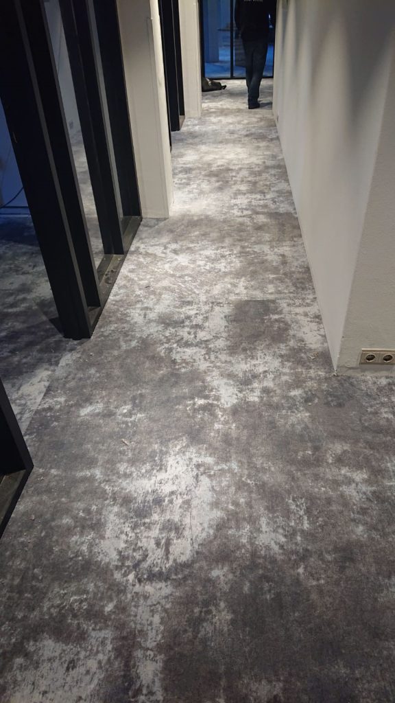 We hebben hier een eigentijdse vloerbedekking toegepast. Met ons UNIQ Print tapijt is een hele zachte betonvloer uitstraling ontstaan.